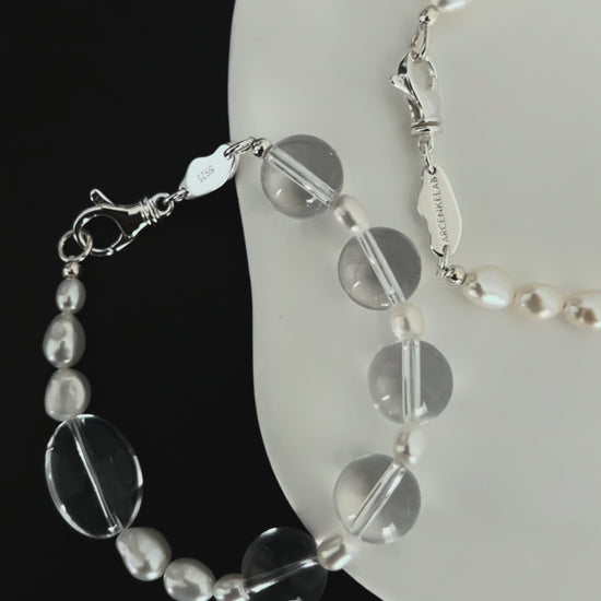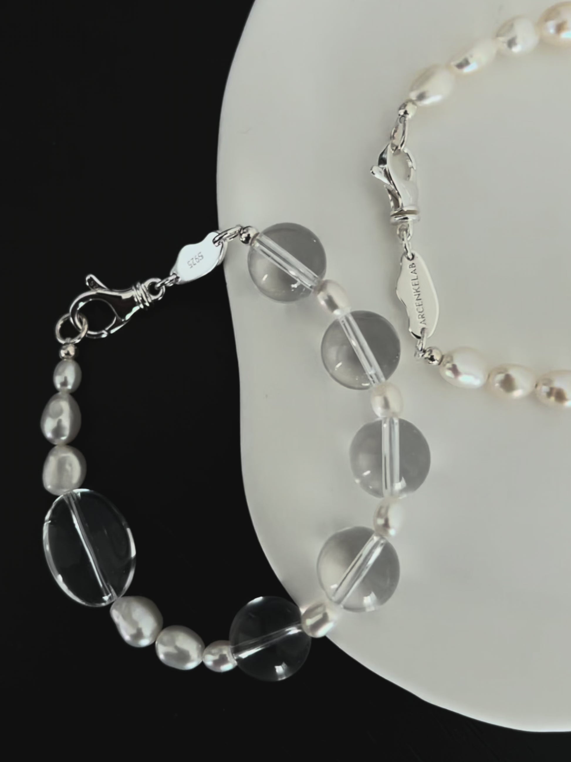 -Natural Brazilian white crystal paired with freshwater pearls for a clean and balanced aesthetic